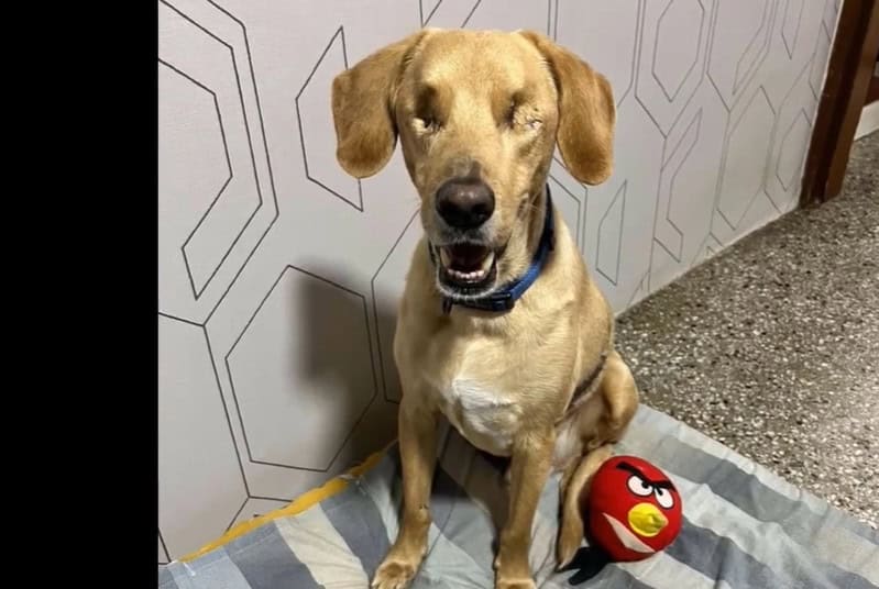 - Состояние: слепота, отсутствие правой задней лапы, следы жестокого обращения
