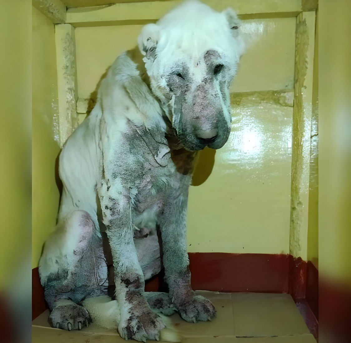Её появление нарушило привычный ток дня: собака стояла у обочины оживлённой дороги — дрожащая, измождённая и растерянная, без понятия, куда идти дальше. Хрупкое тело было истощено до костей, кожа покрыта пятнами от коросты и грязи, а взгляд — потухший и пустой, как у человека, который давно перестал ждать помощи. Проезжие предпочитали отвернуться, не желая смотреть на эту уязвимую реальность.
