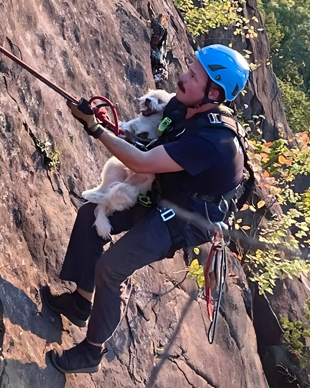 В Восточном Рок‑парке спасатель Мэтт Уолш осуществил рискованный спуск по стене высотой 40 футов (примерно 12 м), чтобы поочерёдно поднять на вершину двух мелких белых собак, застрявших на узкой полке склона.