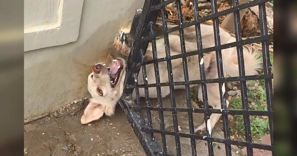 Невероятно трогательная сцена: мелкого щенка обнаружили зажатым под холодными металлическими прутьями. Его маленькое тельце было плотной пробкой между железными брусьями, лапы судорожно двигались в попытке выбраться. Мордочка приоткрыта — казалось, он издаёт пронзительный крик боли; взгляд наполнен паникой и надеждой, словно он умоляет кого‑то подать руку помощи.