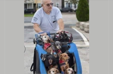 Каждое утро, как только солнце встает, мужчина медленно проходит через свой район с коляской, полной собак!