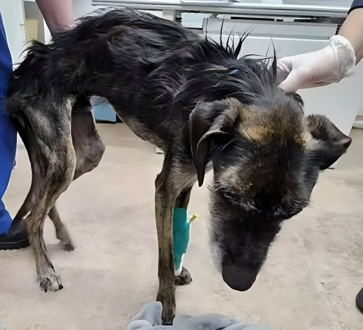 Он был найден почти случайно, стоя в уголке двора. Это существо, когда-то бывшее собакой, сейчас напоминало лишь тень. Его шерсть свисала клочьями, под ней виднелись ребра, а суставы казались слишком большими для такого иссохшего тела. Голову он держал низко, словно жизнь придавила его тяжестью, и держаться на лапах ему было нелегко. Однако в его глазах все еще светился слабый, но не погасший огонек жизни.