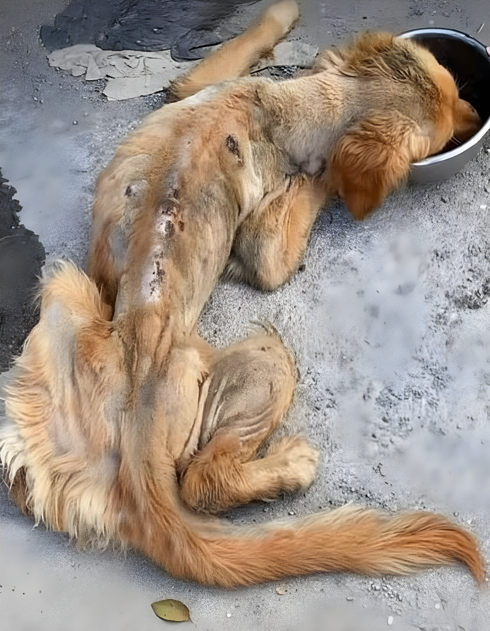 Вид, з яким довелося зіткнутися, був настільки жахливим, що він міг зламати серця. Виснажений до крайнощів, забруднений і покритий відкритими ранами, золотистий ретривер лежав нерухомо біля вм’ятого металевого миски на безлюдному тротуарі. Його колись розкішна шерсть перетворилася на збиті залишки, оголюючи кістки та оголені ділянки шкіри. Це був не просто безпритульний собака; це була свідома на прикладі неймовірних мук, життя, що балансувало на краю прірви. Проходячи, люди часто відводили погляд, не в силах доторкнутися до жорстокої реальності його долі. Собаку, якого рятівники пізніше назвали «Сонячний», здавалося, що він здався, знаходячи спокій тільки в мізерних пожертвуваннях анонімної жалісті. Однак його історія була далеко не завершена. Ніхто не знав, що «Сонячний» готувався до подорожі, наповненої несподіваними поворотами, свідченням стійкості і значної сили єдиного вчинку доброти.