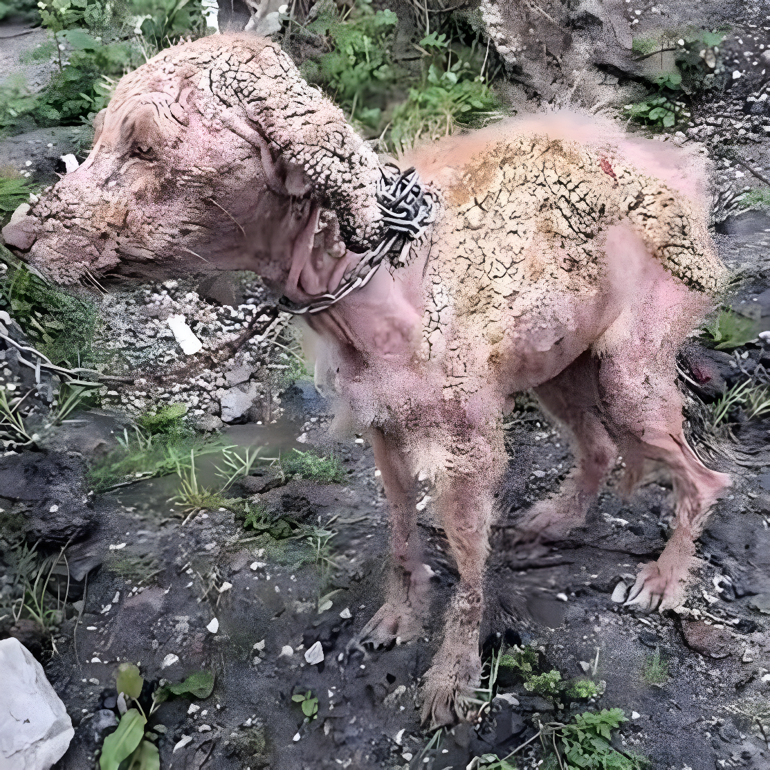 В центре небольшой территории, покрытой гравием и землёй, беззащитный, худой пес лежал, изнеможённый под палящим солнцем. Его голый, иссечённый, трескающийся кожный покров терял куски, а каждое движение причиняло ему ужасную боль, из-за чего из открытых ран сочилась кровь. Ржавый поводок, впившийся в его шею, был так туго натянут, что нежная кожа разрывалась, показывая обнажённые красные ткани. С каждым вдохом раздавался слабый, приглушённый стон, полон страдания и тоски.