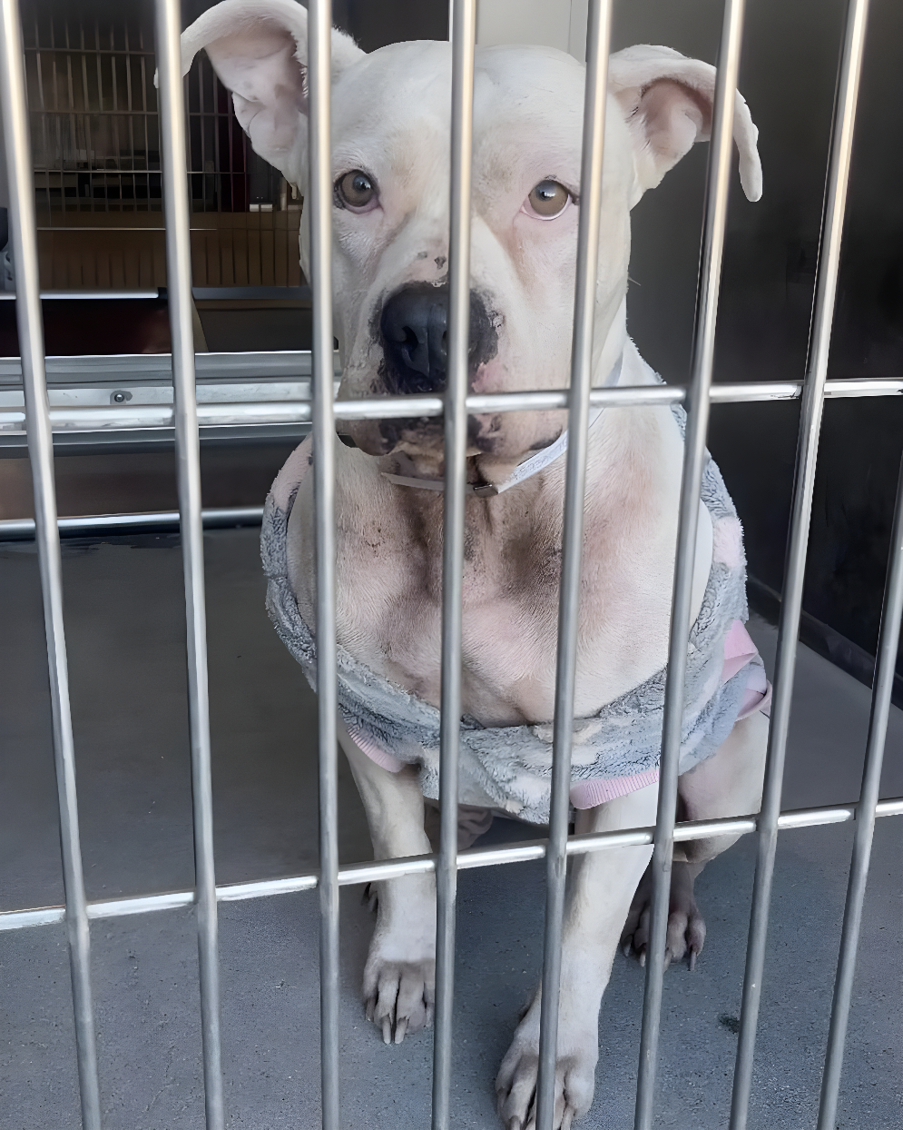 В Центр Ухода за Животными в Ланкастере Корра пришла, дрожащая в маленькой пижаме — такой, что создаёт комфорт для собаки, но не заменяет семью. Она сидела прижмурившись к задней стенке своего вольера, уставившись в холодные металлические прутья, её глаза искали дверь, которая больше никогда не открывалась. Звук лая собак прозвучал вокруг неё, но она осталась тихой, ожидая знакомые шаги, которые не вернулись.