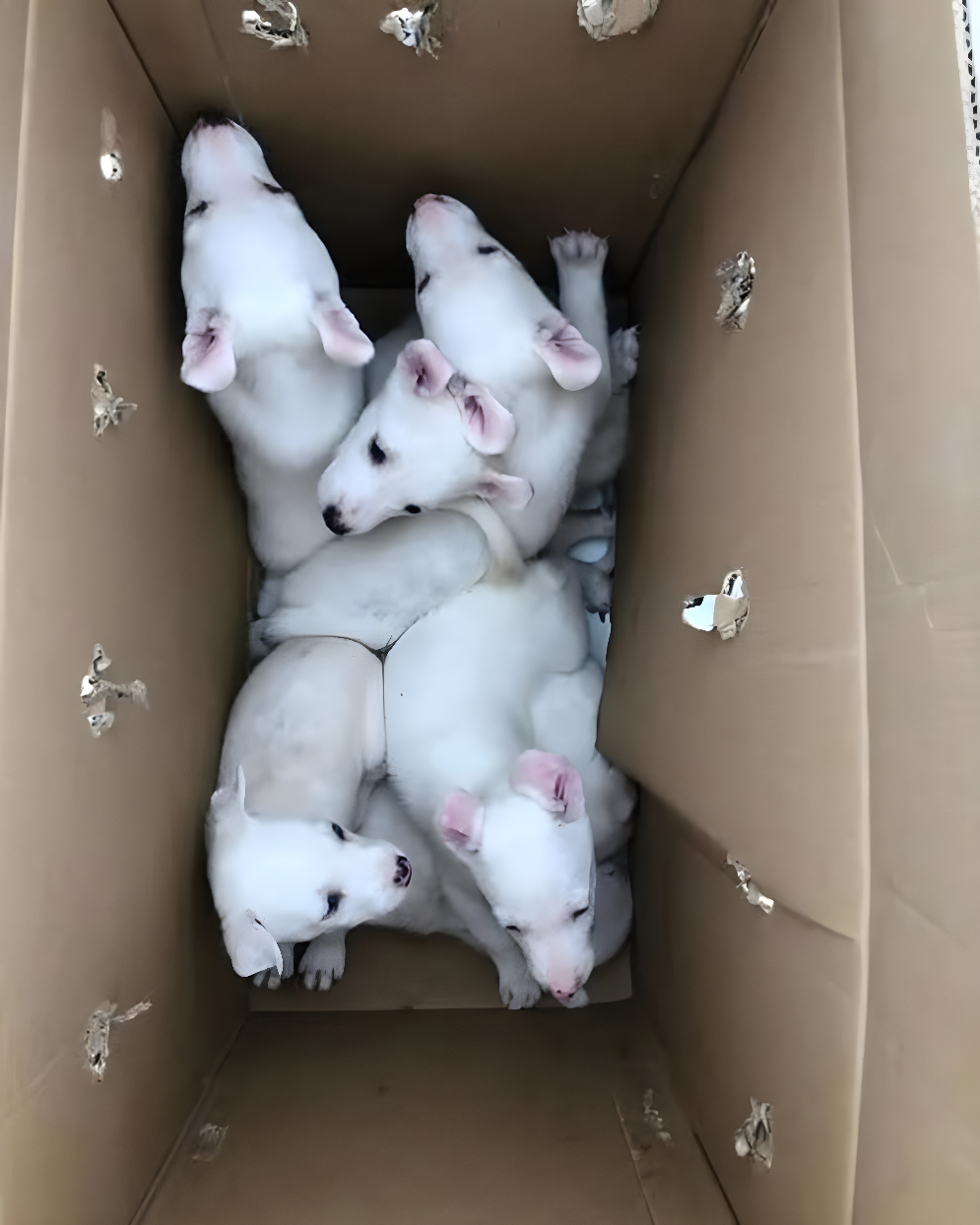 W momencie, gdy zespół ratunkowy zauważył porzuconą skrzynkę na swoim terenie, ich serca zamarły, gdy dostrzegli przekreśloną kartkę z napisem „szczeniaki tutaj”. Otwierając skrzynkę, ich założenia szybko okazały się prawdziwe: w środku znajdowała się gromada malutkich, białych szczeniąt, które wtulały się w siebie, aby ogrzać się nawzajem.