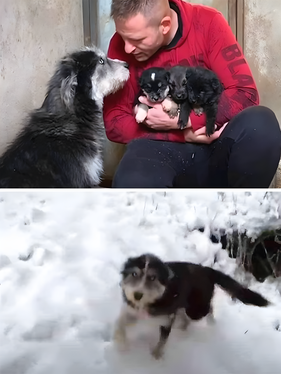 Во время лютых зимних морозов, молодая мать-собака, вероятно, потерявшая надежду на помощь, показалась мужчине, когда он гулял по своему району. Её поведение привлекло его внимание, и, заметив, что собака дрожит от холода, он принял решение подойти и выяснить, в чем дело.