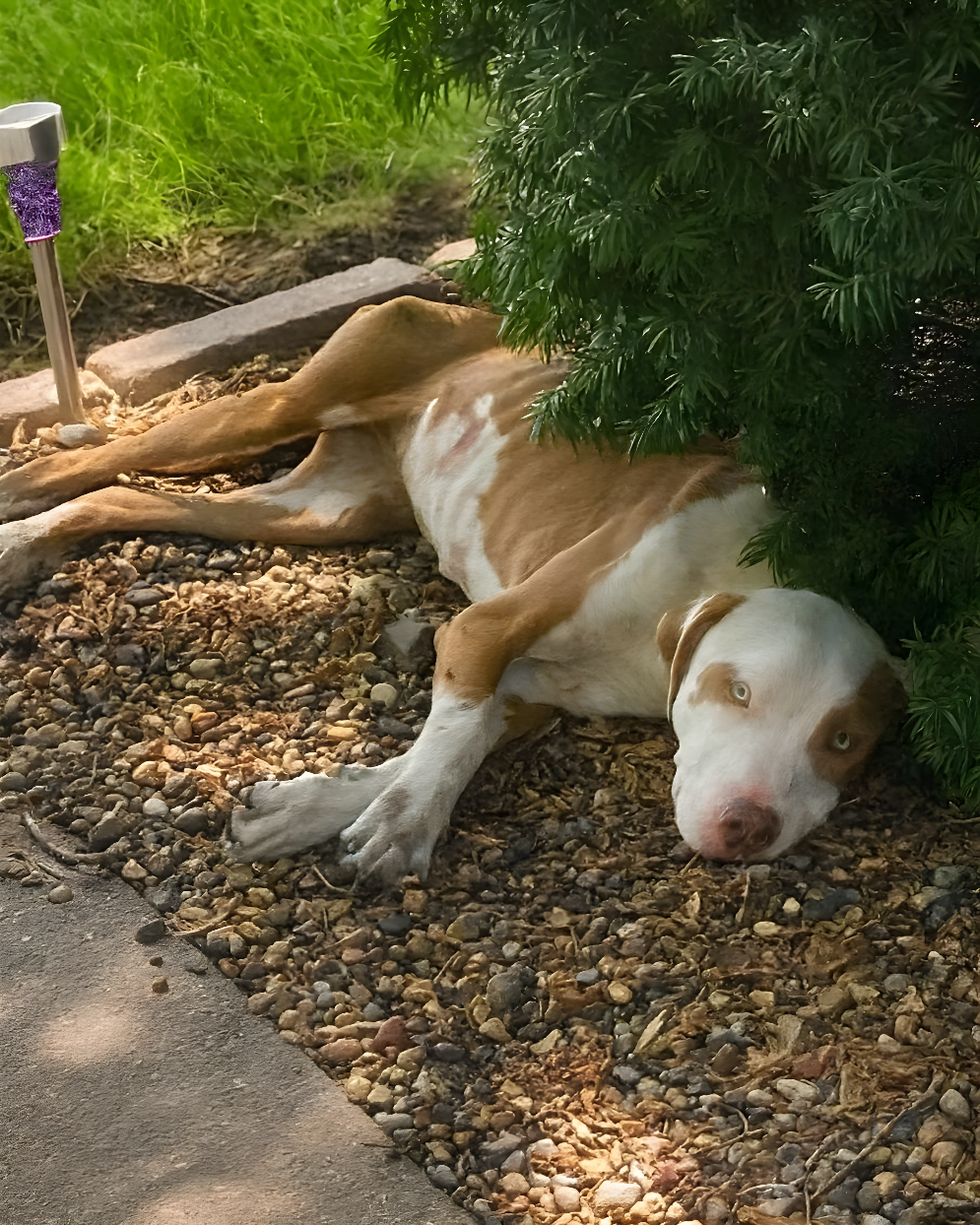 Вона була самотня, без гідного прихистку, в той момент, коли весь світ, здавалося, її забув. Голодні обрики виявлялися чітко помітними, а ее енергія зникла. Коли вона вже не могла рухатися, забралася під кущ, прикрившись від негоди, поклавши голову на землю, немов намагаючись знайти спокій серед усієї цієї безнадії.