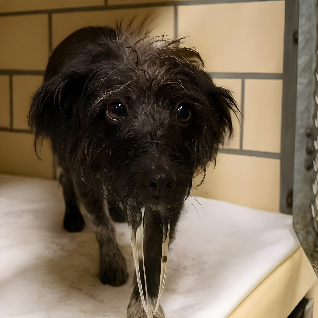 Dźwięk szczekania odbijał się echem w zatłoczonym publicznym schronisku w Chicago, ale jeden boks przyciągnął uwagę ratowników jak magnes. W środku zjawiła się mała, drżąca sunia o imieniu Bella. Przyciśnięta mocno do kąta swojej klatki, z ciałem drżącym jak liść na wietrze, wyglądała, jakby straciła wszelkie poczucie bezpieczeństwa. Ślina spływała jej po twarzy, przemocząc futerko i kapiejąc na podłogę poniżej. To był widok, który opowiadał historię bez potrzeby wypowiadania pojedynczego słowa.