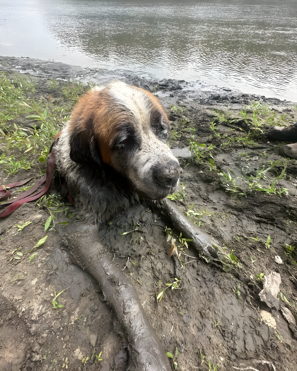 Сенбернар, якого пізніше звали Едом, був закопаний майже до плечей; його важкий фрейм був паралізований шарами липкої глини.