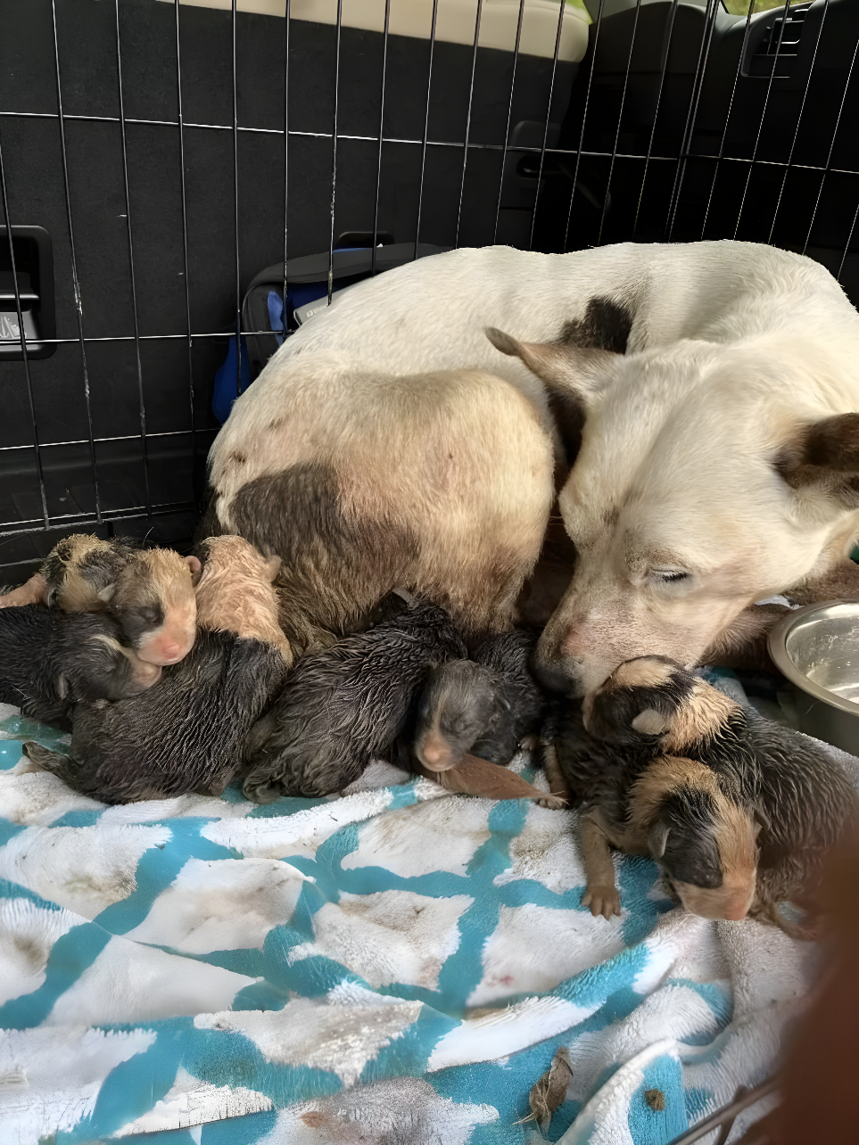 Прижатыми к её телу были несколько крошечных новорожденных щенков, едва способных двигаться. Собака и её малыши дрожали, были вымокшими и полностью покрытыми грязью. Они выглядели истощенными и замерзли. Было очевидно, что им срочно нужна помощь, если они собираются выжить.