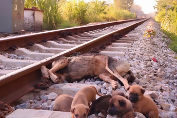 На мрачной сцене, расположенной у холодной железнодорожной колеи, зрелище собаки, неподвижной и с крепко